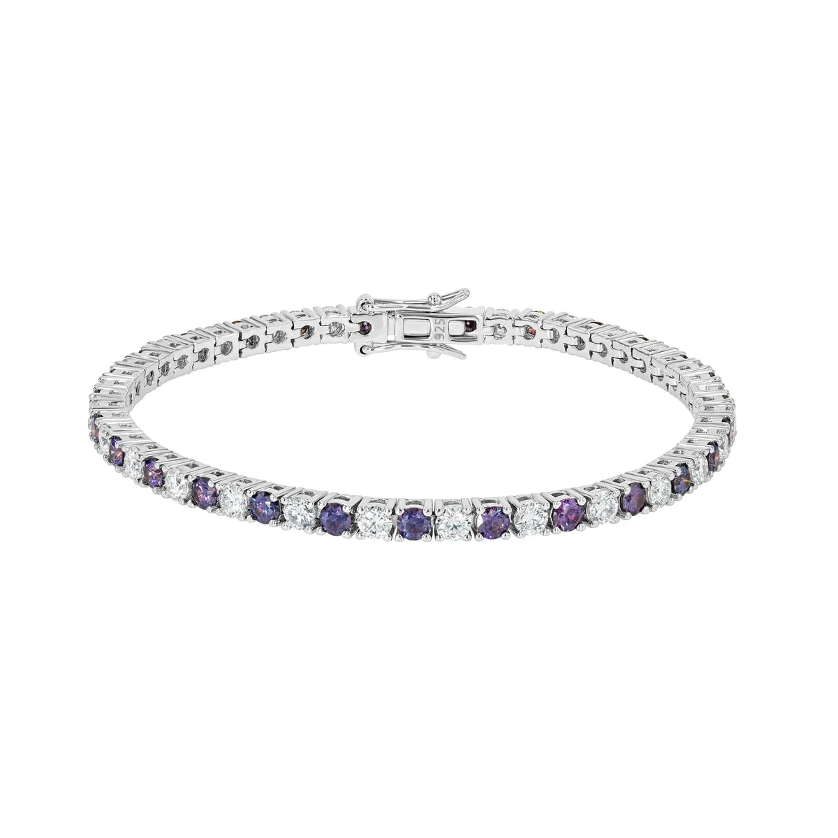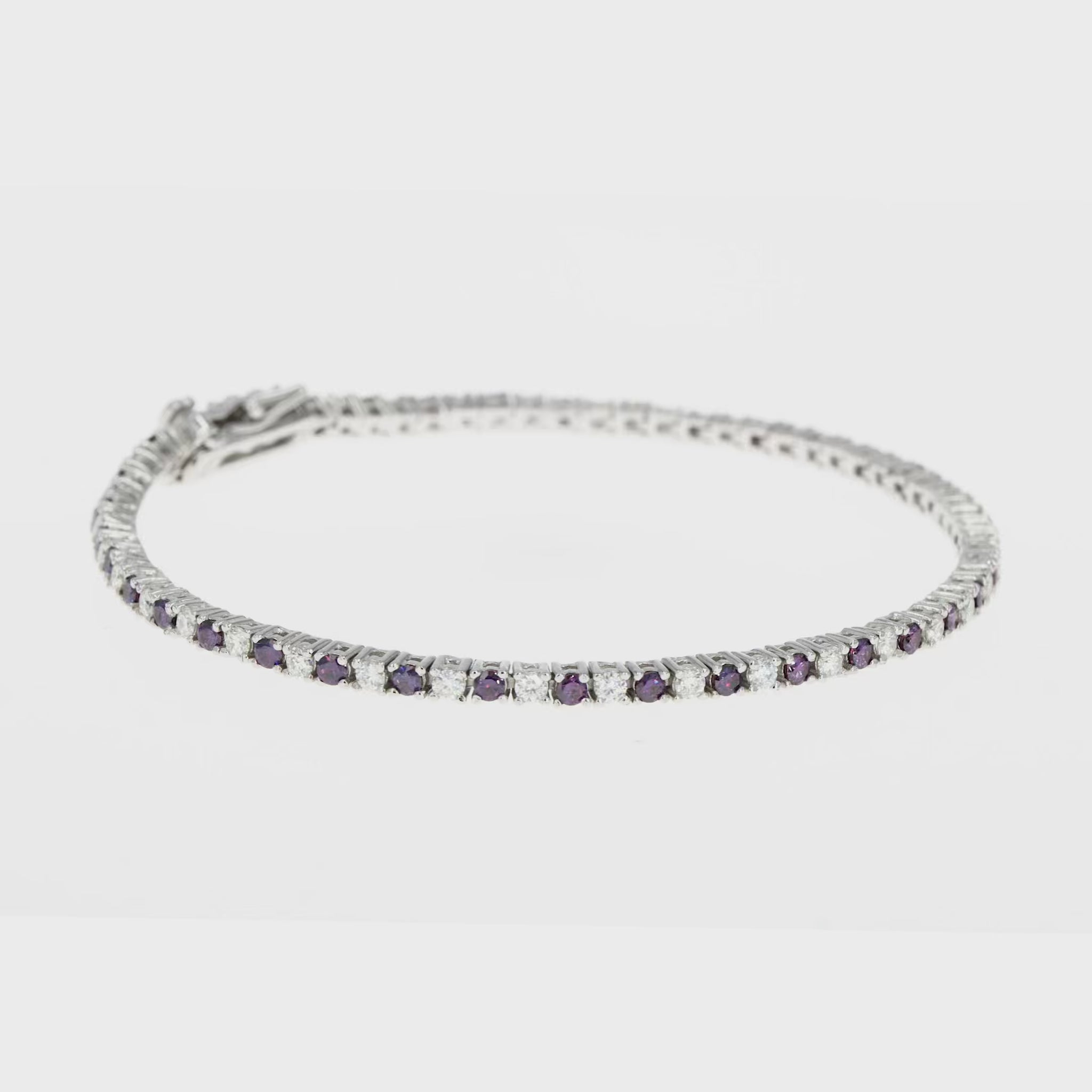 This handmade bracelet features round brilliant amethyst-tone gemstones selected for their vibrant colour and clarity. Each stone is individually set and enhanced by Moissanite Diamond Inspired stones chosen to a D Colour VVS1 clarity standard. These high-performance, diamond-alternative stones provide exceptional brilliance while remaining fully transparent and correctly described. Precision link construction ensures fluid movement and a comfortable fit around the wrist.